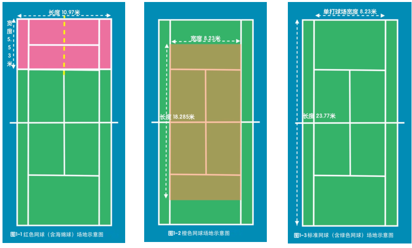 考级场地标准为国际网球联合会(ITF)规定球场标准(如图1-1、2、3)。
