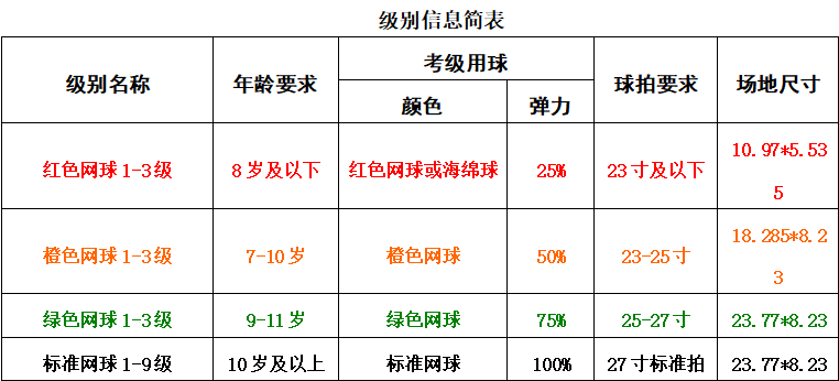 标准网球(10岁及以上)一、二、三、四……九级,共四个阶段九个级别;